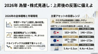 今回は2026年の為替と株価指数の年間展望(見通し、分析)について。幾つかの資料をダウンロード出来ます。注意点や買い場など。 皆さま、あけましておめでとうございます。本年もよろしくお願いいたします。 スリースタータードッ...