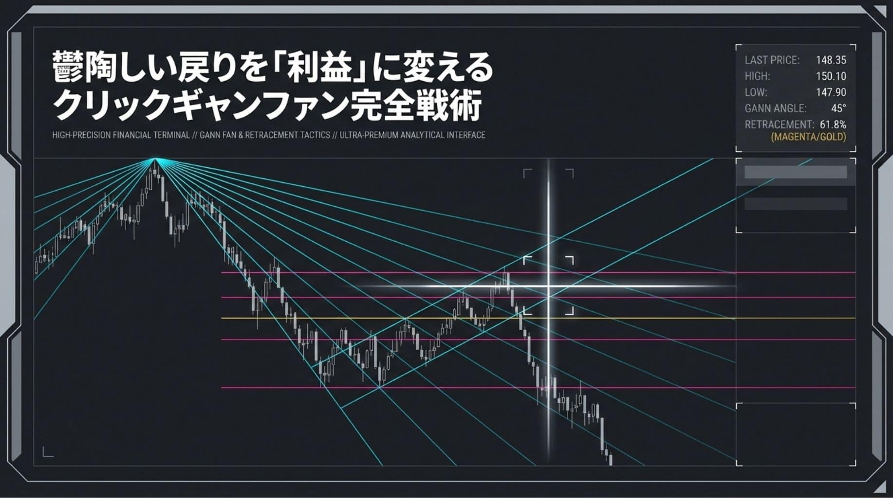 特に「ギャンファン」においては、本講義で解説する「オリジナルの引き方」がベスト。大衆には見えない抵抗帯を可視化し、安全な「押し目買い・戻り売り」をピンポイントで狙い撃つことが可能になります。
